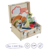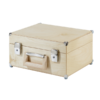 • Abschließbarer, robuster Moderationskoffer aus heimischem Birkenholz mit Tragegriff und Filzgleitern