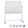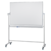 Doppelseitige Schreibtafel auf einem mobilen Stativ. Die horizontale Drehachse ist um 360° schwenkbar und stufenlos arretierbar. Die lackierte Oberfläche ist magnethaftend, trocken und nass abwischbar, sowie beidseitig beschriftbar. Mit integrierter Ablageleiste und vier Doppellenkrollen (davon zwei feststellbar). Das Gestell und der Rahmen sind aus lichtgrauem Metall.