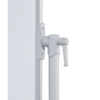 Doppelseitige Schreibtafel auf einem mobilen Stativ. Die horizontale Drehachse ist um 360° schwenkbar und stufenlos arretierbar. Die lackierte Oberfläche ist magnethaftend, trocken und nass abwischbar, sowie beidseitig beschriftbar. Mit integrierter Ablageleiste und vier Doppellenkrollen (davon zwei feststellbar). Das Gestell und der Rahmen sind aus lichtgrauem Metall.