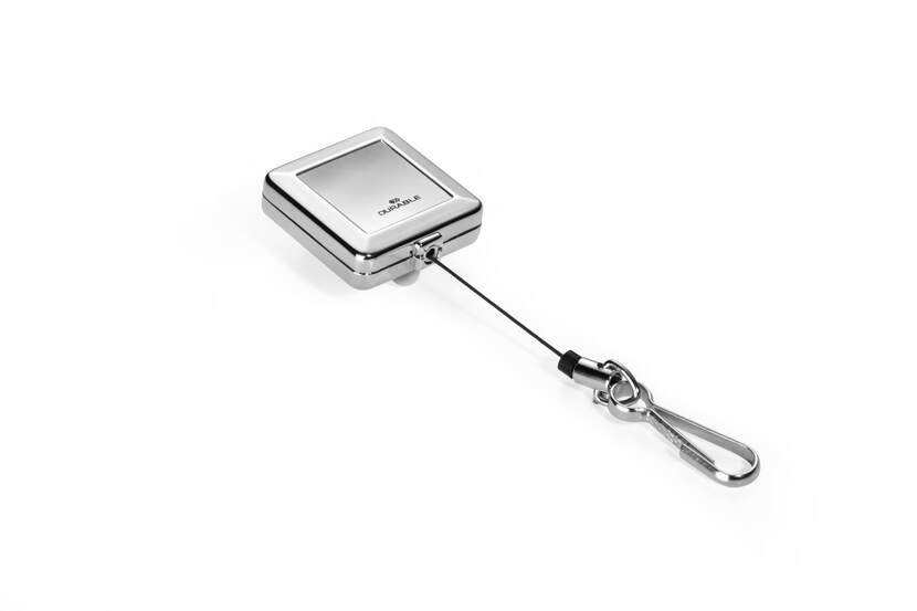 Quadratisches Jojo mit Metallclip-Befestigung und Federhaken für Ausweishalter, Zugangskarten etc.