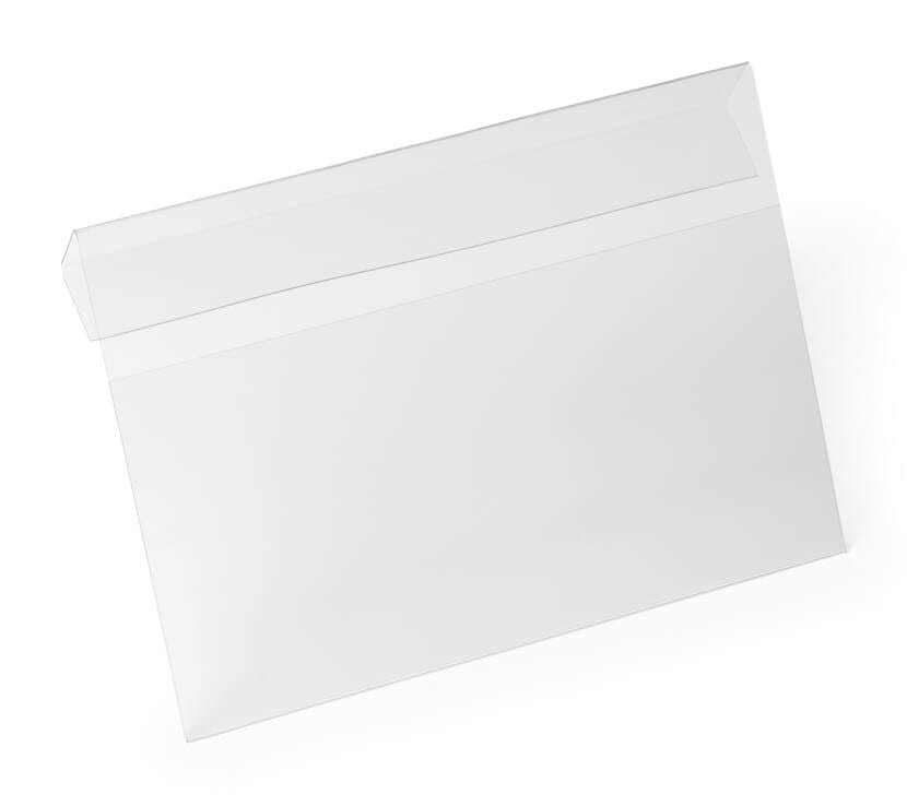 Kennzeichnungstasche aus transparenter Hartfolie. Mit stabiler Falz zum Überhängen an Kartons, Boxen oder anderen Behältern.