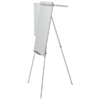 Die mobile Flipchart mit Dreibeinstativ und Stahlöberfläche besitzt an beiden Seiten ausklappbare Verlängerungsarme. Es hat einen unscheinbaren Rahmen und eine Stiftehalterung.