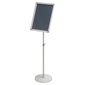 Freistehender Info-Ständer mit praktischer Aluminium-Klapprahmentechnik. Kann einfach im Hoch- oder Querformat angebracht werden. Höhenverstellbar. Movit-Größe: A3