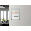 An der Wand befestigter Plakatrahmen für die Präsentation von Postern, Hinweisen und Informationen. Die praktische Aluminium-Klapprahmentechnik sorgt für einen professionellen Eindruck und erleichtert den Posterwechsel. Der stabile Plakatrahmen wird durch traditionelle Eckmontage an der Wand befestigt. Die entspiegelte PVC-Abdeckung ist einfach zu reinigen. Die perfekte Lösung für temporäre oder permanente Motivpräsentationen. Größe: A4